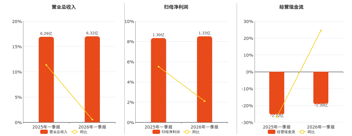 公司营业总收入为6.32亿元。归母净利润为1.33亿元。经营活动现金净流入为-1.30亿元。