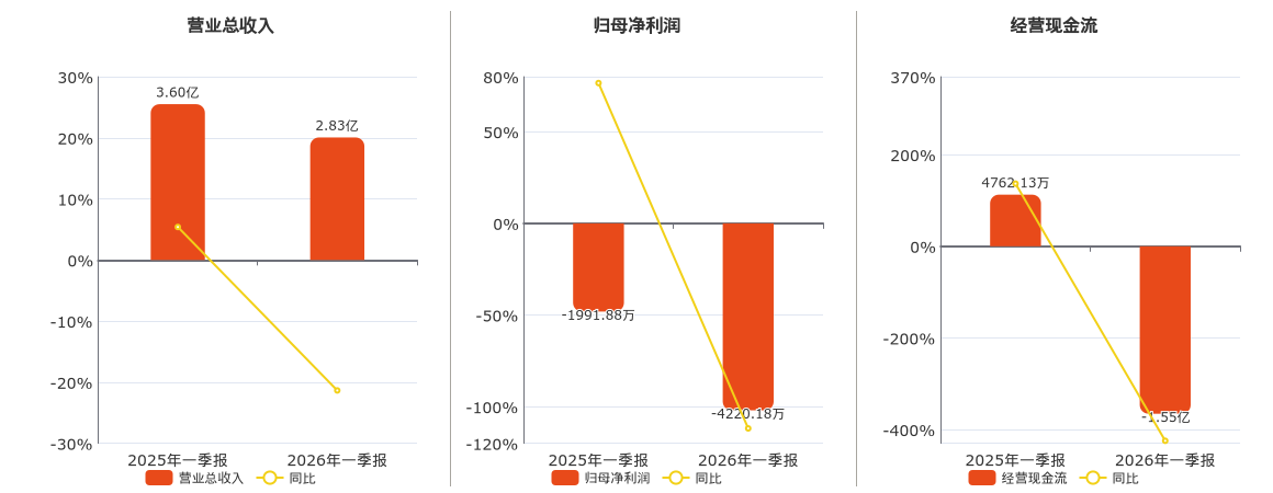 公司营业总收入为2.83亿元,较去年同报告期营业总收入减少7691.26万元,同比较去年同期下降21.35%。归母净利润为-4220.18万元,较去年同报告期归母净利润减少2228.29万元。经营活动现金净流入为-1.55亿元,较去年同报告期经营活动现金净流入减少2.02亿元,同比较去年同期下降424.52%。