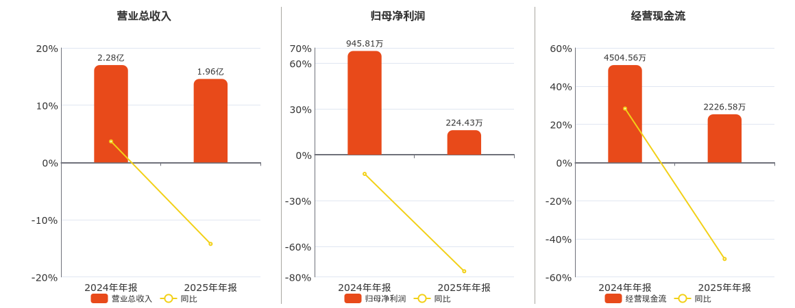 公司营业总收入为1.96亿元,在已披露的同业公司中排名第85,较去年同报告期营业总收入减少3245.21万元,同比较去年同期下降14.23%。归母净利润为224.43万元,在已披露的同业公司中排名第54,较去年同报告期归母净利润减少721.37万元,同比较去年同期下降76.27%。经营活动现金净流入为2226.58万元,在已披露的同业公司中排名第61,较去年同报告期经营活动现金净流入减少2277.98万元,同比较去年同期下降50.57%。