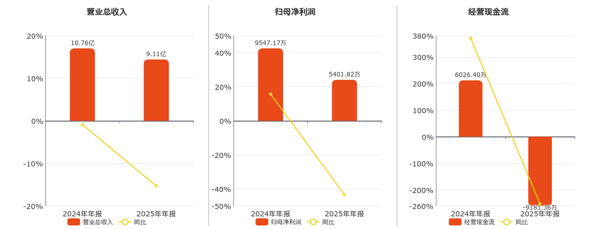 公司营业总收入为9.11亿元,在已披露的同业公司中排名第19,较去年同报告期营业总收入减少1.65亿元,同比较去年同期下降15.30%。归母净利润为5401.82万元,在已披露的同业公司中排名第22,较去年同报告期归母净利润减少4145.35万元,同比较去年同期下降43.42%。经营活动现金净流入为-9181.36万元,在已披露的同业公司中排名第22,较去年同报告期经营活动现金净流入减少1.52亿元,同比较去年同期下降252.35%。
