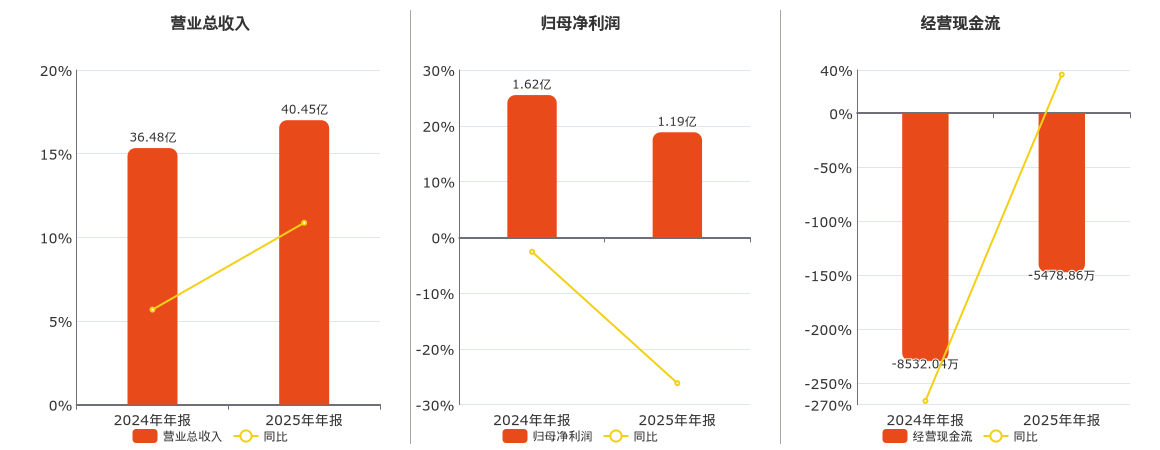 公司营业总收入为40.45亿元。归母净利润为1.19亿元,在已披露的同业公司中排名第109,较去年同报告期归母净利润减少4226.58万元,同比较去年同期下降26.15%。经营活动现金净流入为-5478.86万元,在已披露的同业公司中排名第185。