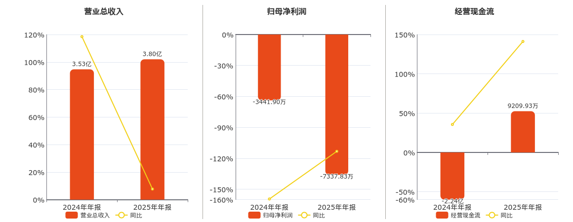 公司营业总收入为3.80亿元,在已披露的同业公司中排名第56。归母净利润为-7337.83万元,较去年同报告期归母净利润减少3895.93万元。经营活动现金净流入为9209.93万元,在已披露的同业公司中排名第34。