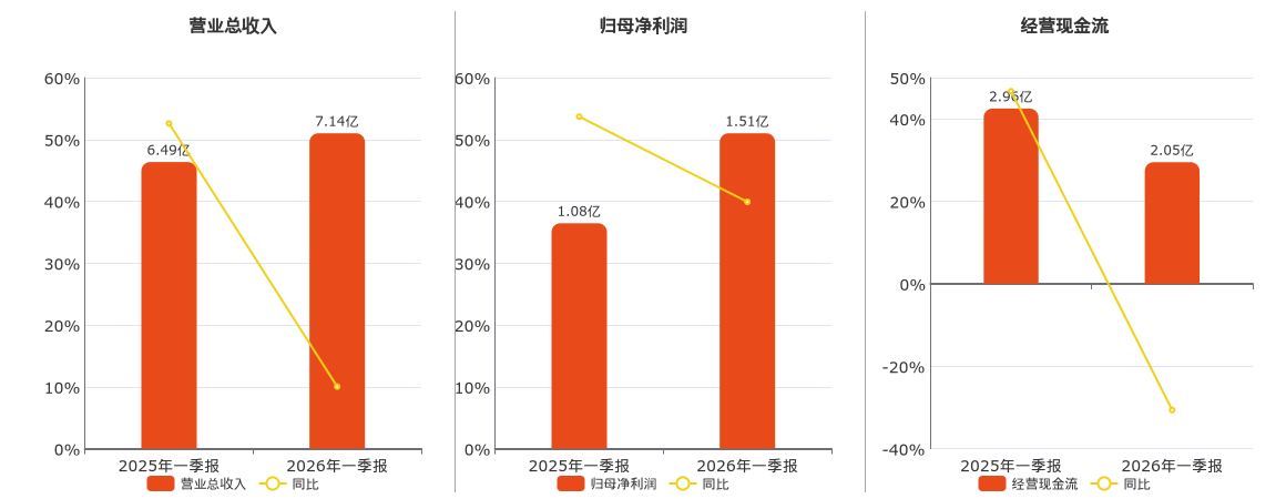 公司营业总收入为7.14亿元。归母净利润为1.51亿元。经营活动现金净流入为2.05亿元,较去年同报告期经营活动现金净流入减少9050.32万元,同比较去年同期下降30.62%。
