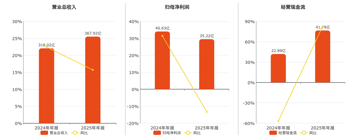 公司营业总收入为367.92亿元。归母净利润为35.22亿元,较去年同报告期归母净利润减少5.40亿元,同比较去年同期下降13.30%。经营活动现金净流入为41.79亿元。