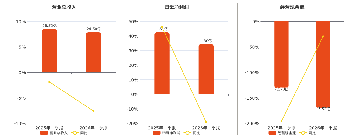 公司营业总收入为24.50亿元,在已披露的同业公司中排名第3,较去年同报告期营业总收入减少2.02亿元,同比较去年同期下降7.62%。归母净利润为1.30亿元,在已披露的同业公司中排名第5,较去年同报告期归母净利润减少3100.64万元,同比较去年同期下降19.22%。经营活动现金净流入为-3.52亿元,在已披露的同业公司中排名第19,较去年同报告期经营活动现金净流入减少7989.53万元。