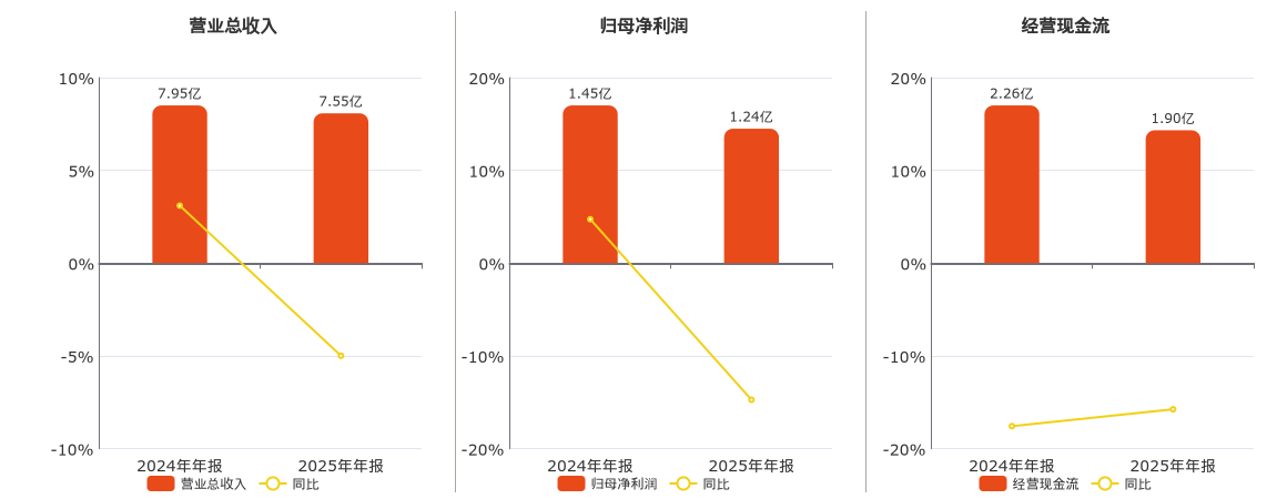 公司营业总收入为7.55亿元,较去年同报告期营业总收入减少3965.40万元,同比较去年同期下降4.99%。归母净利润为1.24亿元,较去年同报告期归母净利润减少2137.25万元,同比较去年同期下降14.73%。经营活动现金净流入为1.90亿元,较去年同报告期经营活动现金净流入减少3555.38万元,同比较去年同期下降15.75%。