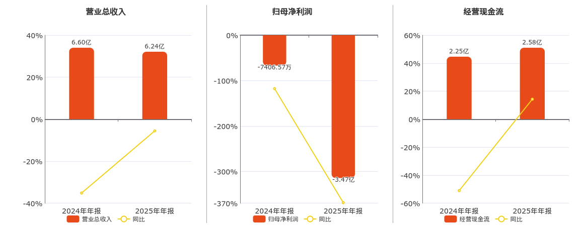 公司营业总收入为6.24亿元,在已披露的同业公司中排名第112,较去年同报告期营业总收入减少3677.57万元,同比较去年同期下降5.57%。归母净利润为-3.47亿元,在已披露的同业公司中排名第140,较去年同报告期归母净利润减少2.73亿元。经营活动现金净流入为2.58亿元。