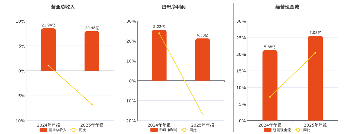 公司营业总收入为20.46亿元,在已披露的同业公司中排名第33,较去年同报告期营业总收入减少1.48亿元,同比较去年同期下降6.76%。归母净利润为4.33亿元,较去年同报告期归母净利润减少8839.94万元,同比较去年同期下降16.95%。经营活动现金净流入为7.08亿元。