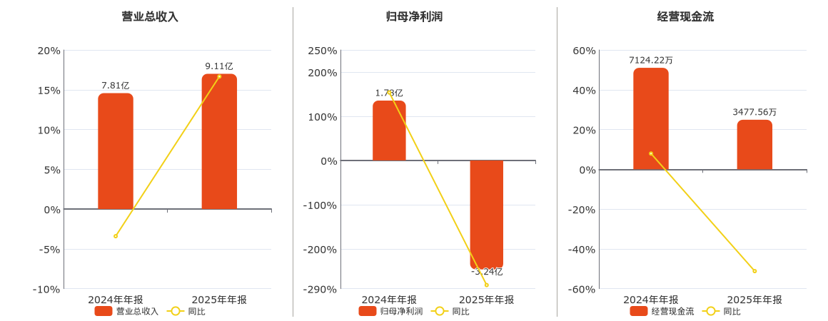 公司营业总收入为9.11亿元,在已披露的同业公司中排名第194。归母净利润为-3.24亿元,在已披露的同业公司中排名第250,较去年同报告期归母净利润减少5.03亿元,同比较去年同期下降281.95%。经营活动现金净流入为3477.56万元,在已披露的同业公司中排名第224,较去年同报告期经营活动现金净流入减少3646.66万元,同比较去年同期下降51.19%。