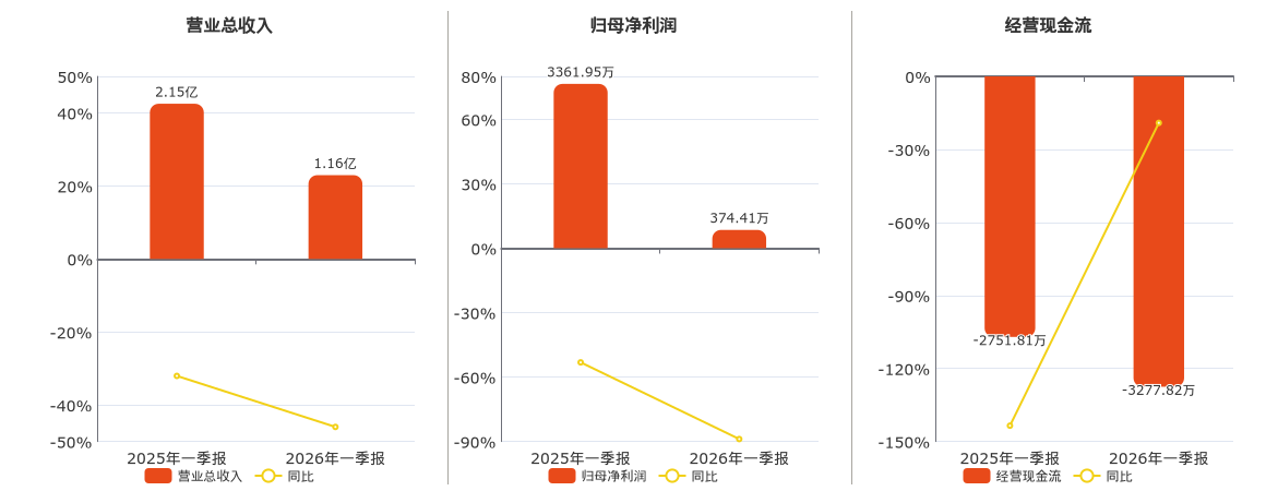 公司营业总收入为1.16亿元,在已披露的同业公司中排名第137,较去年同报告期营业总收入减少9898.87万元,同比较去年同期下降46.01%。归母净利润为374.41万元,在已披露的同业公司中排名第134,较去年同报告期归母净利润减少2987.53万元,同比较去年同期下降88.86%。经营活动现金净流入为-3277.82万元,在已披露的同业公司中排名第130,较去年同报告期经营活动现金净流入减少526.01万元。