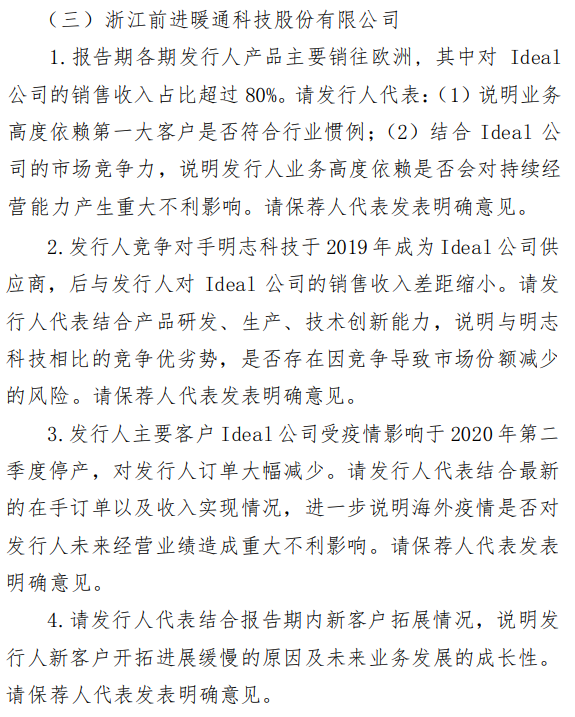 前进科技的主营业务为铝合金冷凝式热交换器的研发、生产和销售,为下游燃气壁挂炉品牌厂商提供冷凝式热交换器的专业配套。据审议结果公告显示,上市委对前进科技主要提出了四个问题,均围绕其对单一客户的高度依赖,公司未来业务发展的成长性遭到质疑。