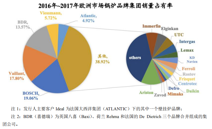 根据 BSRIA(佰世越)研究机构对2016年~2017年欧洲市场各壁挂炉品牌销量情况的统计显示,Ideal所属的法国大西洋集团(Atlantic)的市场占有率为4.92%,而前四大品牌博世(Bosch)、威能(Vaillant)、喜德瑞(BDR)、菲斯曼(Viessmann)的市场份额分别为19.06%、17.80%、13.57%、5.72%。可见,Ideal的市场占有率较头部品牌仍有十余个百分点的差距。