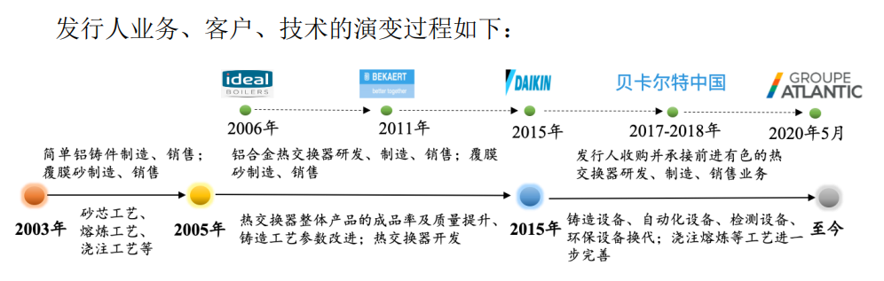 招股书显示,前进科技自2006年起成为Ideal的供应商,之后分别在2011年、2015年陆续开发了贝卡尔特(Bekaert)、大金土耳其(Daikin Turkey)两大海外客户。2017年1月、2018年7月,前进科技分别开始向贝卡尔特(Bekaert)的中国子公司贝卡尔特(中国)技术研发有限公司、贝卡尔特采暖科技(苏州)有限公司销售产品。2019年9月,公司开始接触Ideal所属的法国大西洋集团(Atlantic),并于2020年5月正式供货。也就是说,在前进科技业务开展至今的17年里,公司开发的客户用一只手都能数得过来。