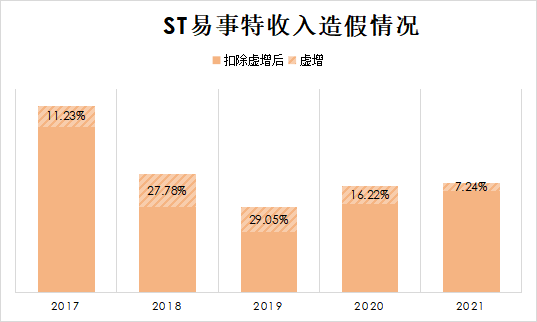 通过上述三种情形,ST易事特2017年至2021年分别虚增营业收入8.22亿元、12.93亿元、9.72亿元、6.76亿元、3.11亿元,分别占当年披露营业收入的11.23%、27.78%、29.05%、16.22%、7.24%。