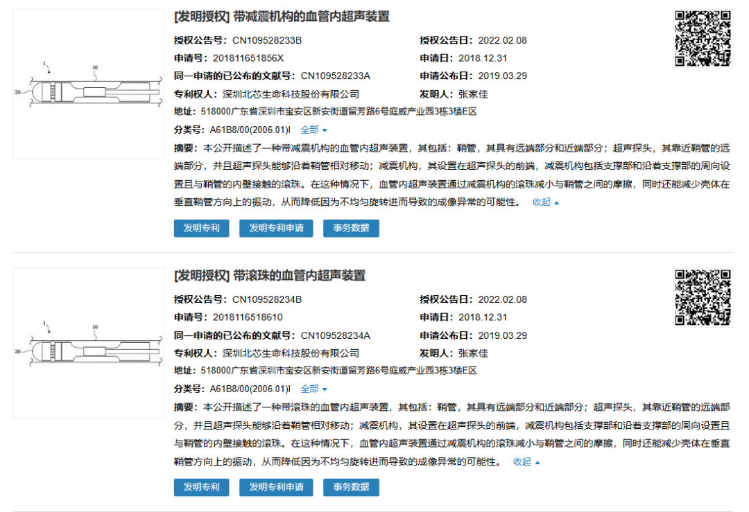 在申请上述发明专利的同一天,北芯生命还申请了实用新型专利“带减震机构的血管内超声装置”(专利号:ZL201822265490.4)和“带滚珠的血管内超声装置”(专利号:ZL201822265872.7),专利内容与同名发明专利几乎一样。