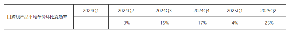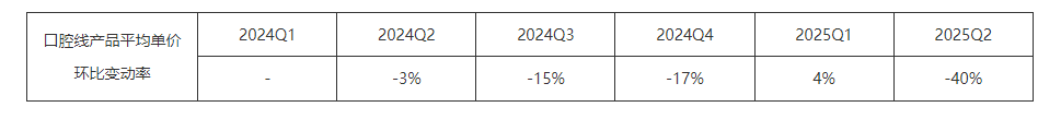 按照上述价格变动计算,若以2024年第一季度作为基期,2025年第二季度的口腔线产品单价约为基期的42.7%,与2024年第二季度相比下跌超过55%。