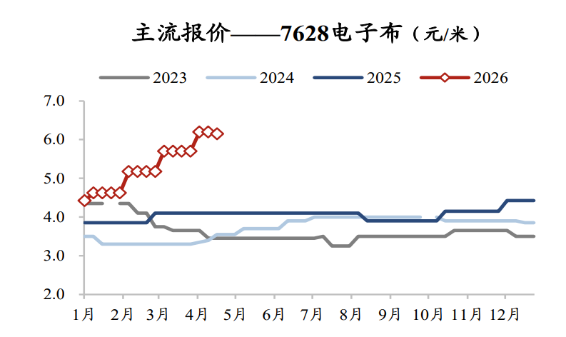 根据东吴证券研报,4月11日至17日这一周,电子纱G75主流市场成交价格在11800—12500元/吨,7628电子布成交价格在6.0—6.3元/米。以主流报价中位数计算,同比增幅分别为285.7%、200%。