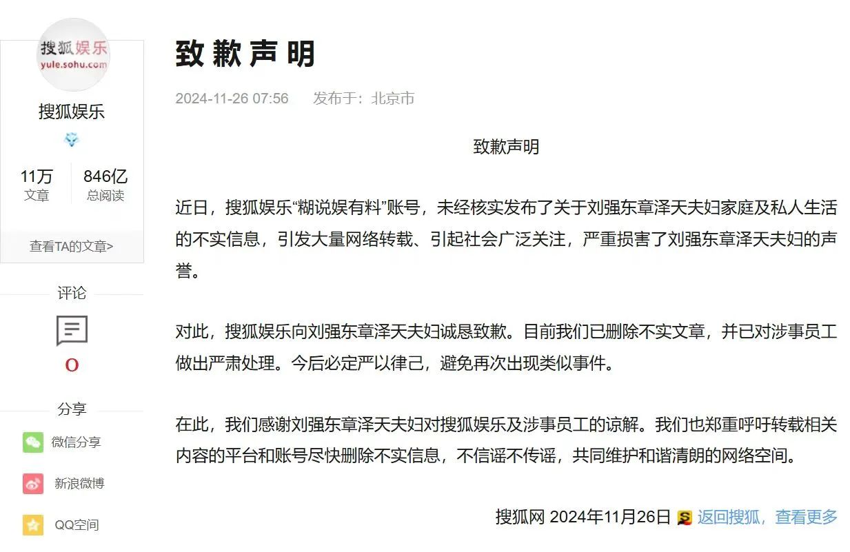 11月26日,因造谣刘强东章泽天夫妇,搜狐娱乐“糊说娱有料”账号公开道歉。还有不少机构媒体、达人已公开向京东道歉,真相终得大白。