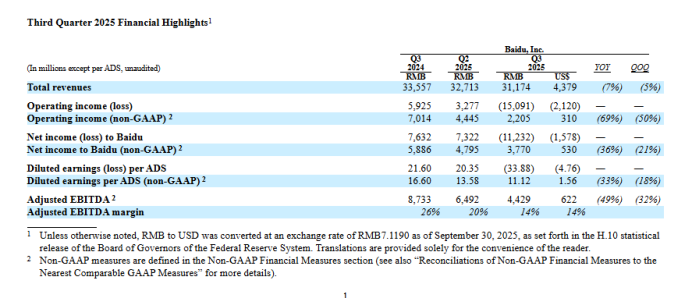 2025年第三季度财报显示,百度总营收达到312亿元,核心业务收入为247亿元。其中,AI云收入同比增长33%;AI应用收入达26亿元;AI原生营销服务收入同比增长262%达28亿元,凸显了AI技术在商业化应用中的潜力。