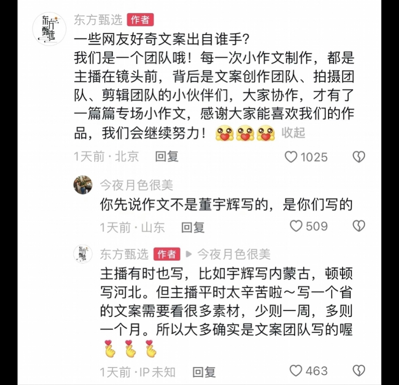 据悉,12月8日,东方甄选开启了三天的“吉林行”。在东方甄选一则“吉林之行”视频下,小编置顶了一条“宣传文案出自谁手”的解答评论,称“每一次小作文制作,都是主播在镜头前,背后是文案创作团队、拍摄团队、剪辑团队的小伙伴们,大家协作,才有了一篇篇专场小作文。”上述回复引发了董宇辉粉丝群体的不满。有粉丝认为,这是对董宇辉的一种“背刺”,否认他为东方甄选做出的贡献。