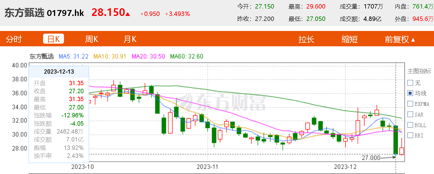 12月13日港股收盘,东方甄选股价大跌12.96%,一天市值蒸发超40亿港元震惊了整个市场。作为一家备受瞩目的电商平台,东方甄选一直以来都是业界的佼佼者,其市值一路飙升。然而,就在人们还在为东方甄选的辉煌而欢呼的时候,一场突如其来的风暴却让这家公司陷入了困境。