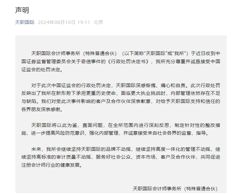 8月16日晚,中国证监会发布对天职国际的处罚决定。当日晚间,天职国际在微信公众号针对相关事项发布声明。