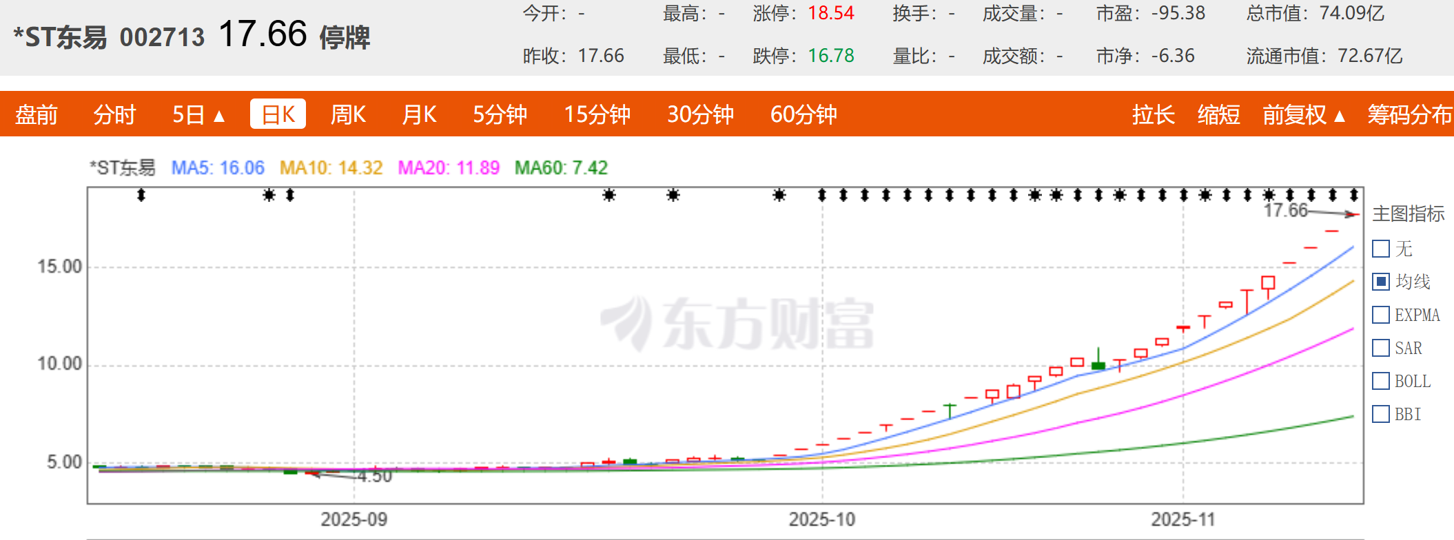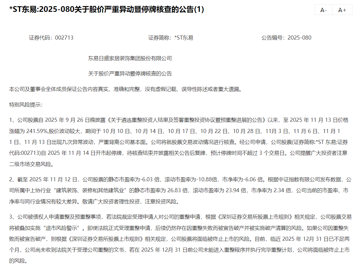 11月13日晚,*ST东易发布停牌核查公告。公告显示,该公司股票自2025年9月26日晚披露《关于遴选重整投资人结果及签署重整投资协议暨预重整进展的公告》以来,至2025年11月13日价格涨幅为241.59%,股价波动较大,期间于10月10日、10月14日、10月17日、10月22日、10月28日、11月3日、11月6日、11月11日、11月13日出现九次异常波动,严重背离公司基本面。公司将就股票交易波动情况进行核查。经公司申请,公司股票(证券简称:*ST东易;证券代码:002713)自2025年11月14日开市起停牌,待核查结束并披露相关公告后复牌,预计停牌时间不超过3个交易日。