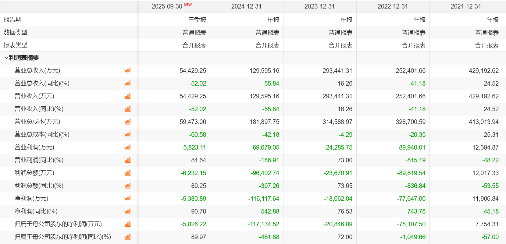2025年前三季度,*ST东易实现的营业收入为5.44亿元,同比下降52.02%;归母净利润为亏损0.58亿元,依旧亏损。