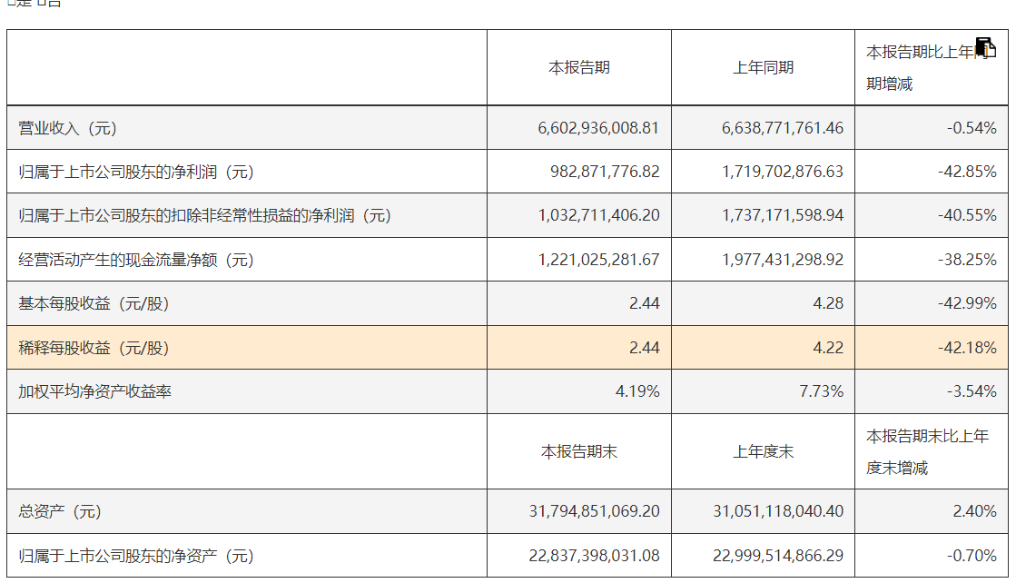 2025年半年报显示,长春高新上半年实现营业收入66.03亿元,同比下降0.54%;归母净利润9.83亿元,同比大幅收窄42.85%。
