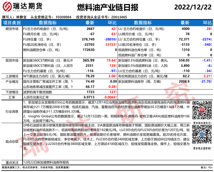 瑞达期货燃料油产业日报20221222