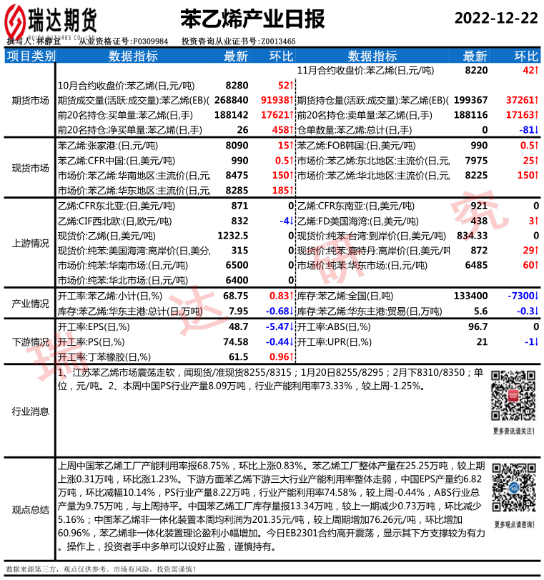 瑞达期货苯乙烯产业日报20221222