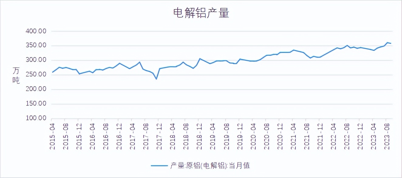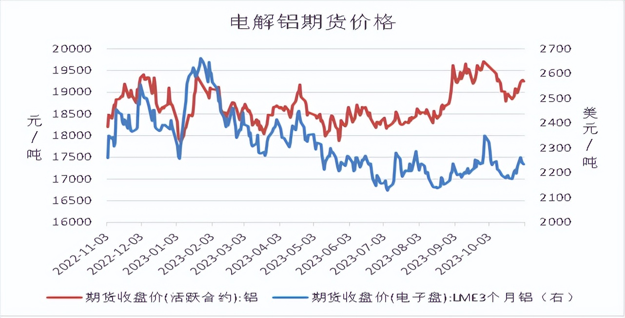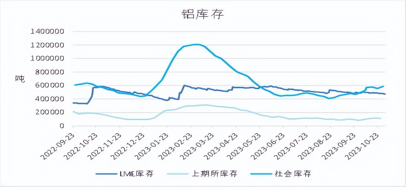 10月初美国非农就业人口数据大超预期及前值,加上最新通胀数据仍离美联储目标相差甚远,在此情况下让市场预期美联储将进一步加息预期上升,有色金属承压。而沪铝双节前因价格高位导致下游备货情绪不强,而假期电解铝产能维持生产,前期转移货源及常规发货的集中到货下,库存增加且增幅明显强于往年同期,宏观及基本面施压电解铝价格。10月末,中央财政将增发国债1万亿元的利好消息影响,铝价提振,而此时传出云南省考虑到枯水期跨度时间长及来年的工业用电需求量,省内电解铝企业或有减产,电解铝期价大幅走强,后减产落地,铝价保持高位震荡。