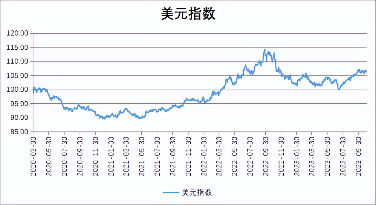 11月时美联储连续两次利率决议按兵不动,符合市场预期。本次决议声明新增指出美债收益率攀升带来的金融环境收紧可能对经济和通胀有影响。在发布会上,美联储主席鲍威尔表示,美联储可能需要进一步加息,暂停后再次加息会很困难的观点是不正确的。美联储目前完全没有考虑降息,也没有讨论过降息。会议后各期限美债收益率集体下跌,市场认为本次美联储发言基调较为鸽派。美国10月ADP就业人数增加11.3万人,远不及预期的15万人,也是连续三个月不及预期,前值为8.9万人。10月份薪资同比上涨5.7%,增速连续第13个月下降,整体劳动力市场或持续降温。美国10月ISM制造业PMI降至46.7,单月降幅为一年多来最大,创下三个月新低,预期将持平于预期49。其中,新订单分项指数创5月以来新低。制造业PMI指数意外降低或反映美国经济增速正逐渐放缓,新订单指数的下滑映照需求有所回落。往后看,美元指数在利率预期逐渐下调且经济走弱的影响下或有所回落,但短期内美国与非美国家之间的利差或将持续给予美元指数一定支撑。