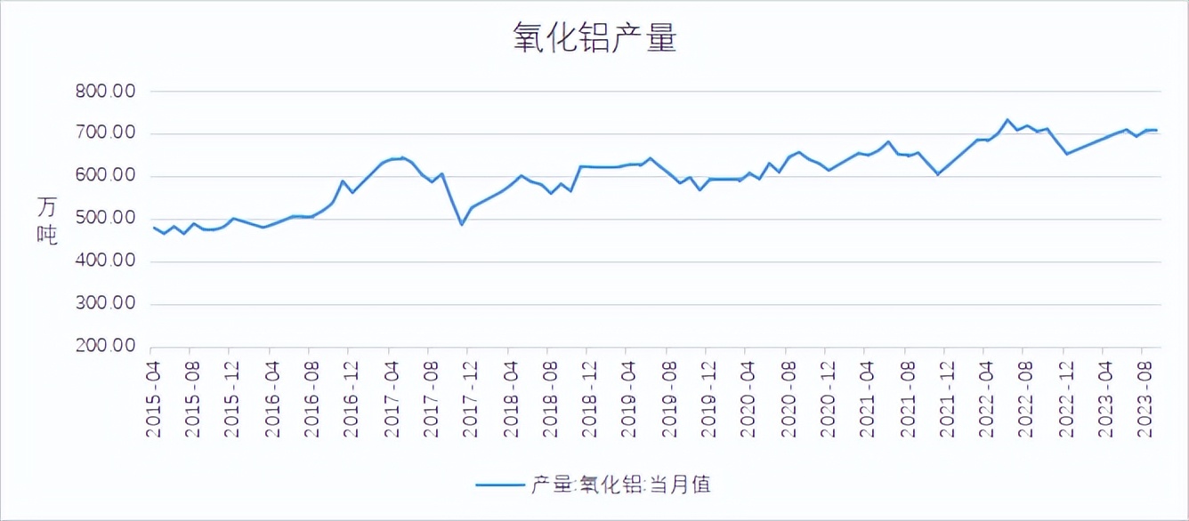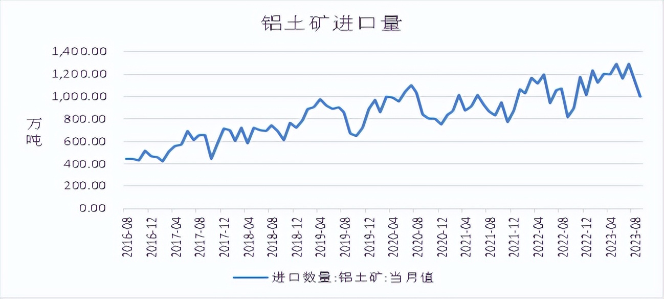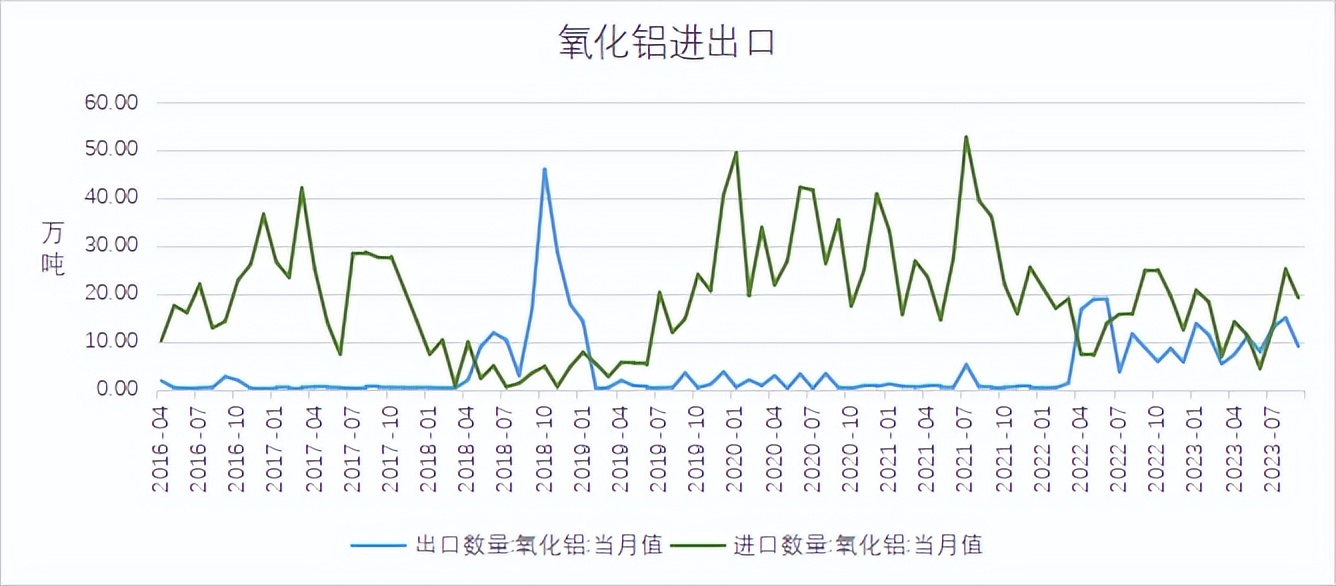 海关总署数据显示,2023年9月,当月进口铝土矿1002.41万吨,环比下降13.83%,同比增加22.8%。1-9月,进口铝土矿10664.22万吨,同比增加12.71%。几内亚仍为最大供应国,几内亚矿石发运受到雨季影响环比减少。氧化铝产量方面,国家统计局数据显示,2023年9月,氧化铝产量为707.25万吨,环比小滑,主因部分地区部分产能因矿石供应紧张处于停产状态,加上个别氧化铝厂因检修影响整体产能开工,故9月产量较8月有所下降,部分氧化铝厂于10月份有检修计划,部分企业受矿石及烧碱等成本上移或难以进一步提产,不过部分地区前期检修的企业均已恢复生产贡献部分增量,增减相抵下,10月氧化铝产量或小幅上涨。氧化铝进出口方面,海关总署数据显示,2023年9月,氧化铝进口量为19.14万吨,环比减少23.89%,同比减少23.06%;氧化铝出口量为9万吨,环比减少40%,同比增加3.88%;1-9月,氧化铝累计进口133.13万吨,同比减少6.16%。9月以来,国内氧化铝紧平衡的供需关系使其价格震荡偏强,而海外氧化铝价格小幅回落,进口亏损逐步收窄,不过国内氧化铝价格高位,利润逐步修复下企业或稳产及高产,而电解铝复产结束云南突发减产,需求端暂无较大增量,氧化铝进口或减少。