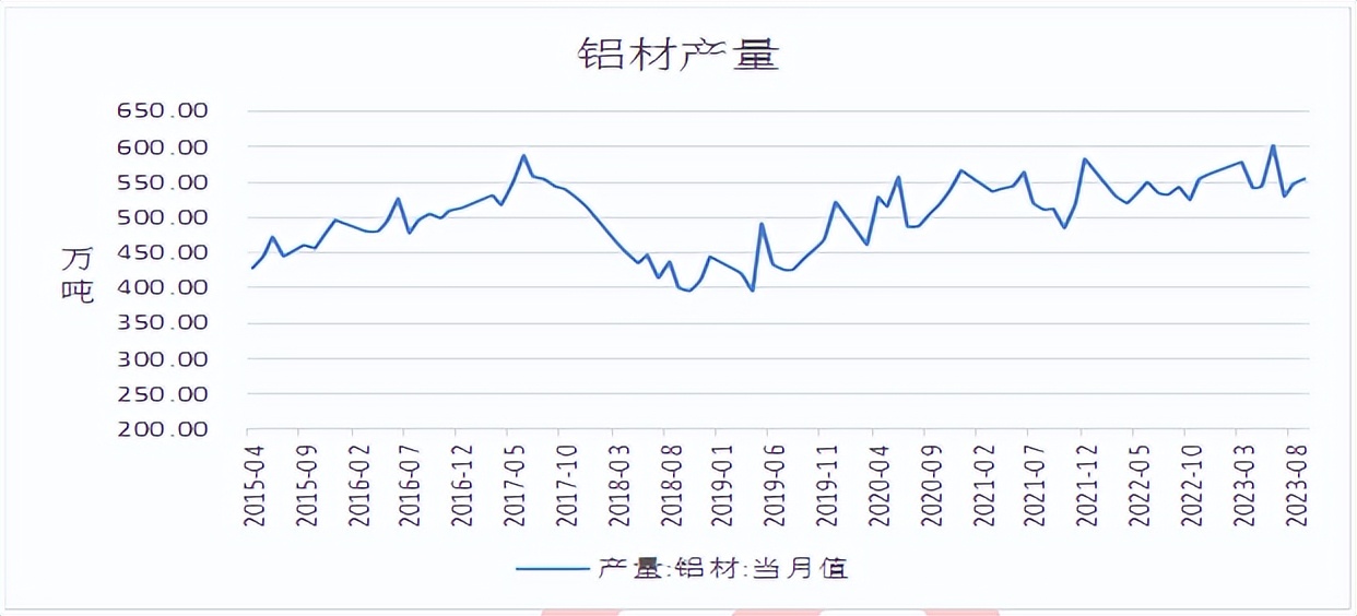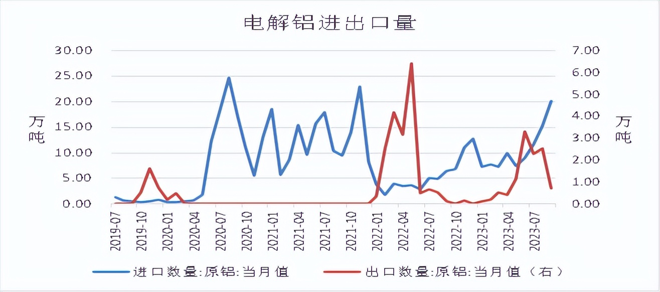 进出口方面,海关总署数据显示,2023年9月电解铝进口量为20.07万吨,同比增加210.29%;1-9月电解铝累计进口95.55万吨,同比增加164.77%;2023年9月电解铝出口量为0.7万吨,1-9月电解铝累计出口11.23万吨。9月原铝进口窗口延续打开,该月进口得以创年内新高。10月,宏观压力下,加上国内“银十”消费不及预期,国内铝价回落明显,原铝进口盈利逐步收窄,进口窗口关闭,虽前期进口窗口长期打开下仍有部分货源陆续到港,但年底进口量或下降明显。