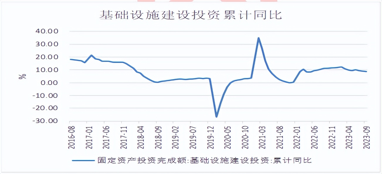数据显示,2023年1-9月,基础设施投资同比增加8.64%。随着今年专项债发行基本结束,地方财政压力显现,基建项目进展放缓,后续基建投资对于经济支撑作用或减弱。2023年9月,房地产开发景气指数为93.44,较上月减少0.11,较去年同期减少1.36。前期国家降首付、利率,认房不认贷等政策利好政策密集出台,但政策落地仍需要一定时间,整体房地产市场仍以修复为主。在托底经济背景下,房地产优化政策还会持续推进,预计四季度需求会得到提振。