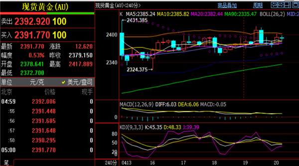 黄金行情走势分析:昨日周五黄金价格并没有如预期出现破位下跌的情况,日内给出的有效支撑2373位置多次触底反弹,最终收报2391一线。本周整体来看黄金价格上涨48个点,振幅+2.05%,且实现金价连续5周保持上涨。对于第二季度黄金价格刘铭诚维持高空思路不变,下周黄金关注日线SAR抛物线指标2420和前期高点2431两个阻力节点看空,技术面日线上MACD快慢线超买区域将结死叉,红色动能柱逐步缩量,KDJ随机指标死叉下探,STO相对强弱指标同样处于超买区域向下发散,直观指标逐渐转变为空头,那么下周维持高空黄金思路不变。