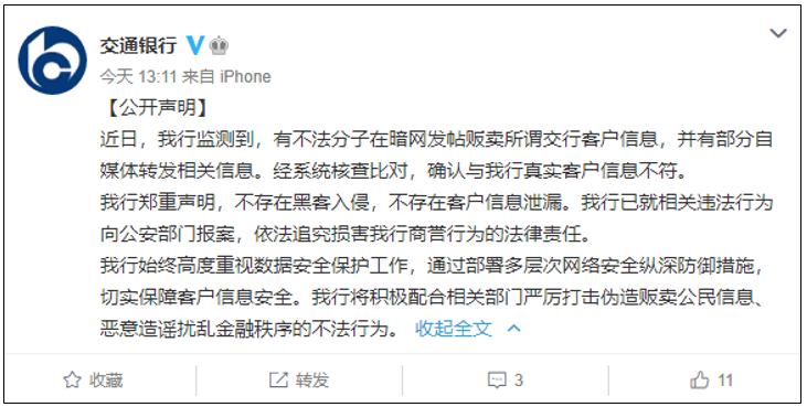 1月12日,交通银行通过官网发布声明称,经系统核查比对,确认与交通银行真实客户信息不符。交通银行郑重声明,不存在黑客入侵,不存在客户信息泄漏。交通银行已就相关违法行为向公安部门报案,依法追究损害商誉行为的法律责任。