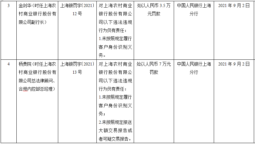 时任上海农商银行副行长金剑华因未按照规定履行客户身份识别义务,被中国人民银行上海分行处以人民币3.5万元罚款。