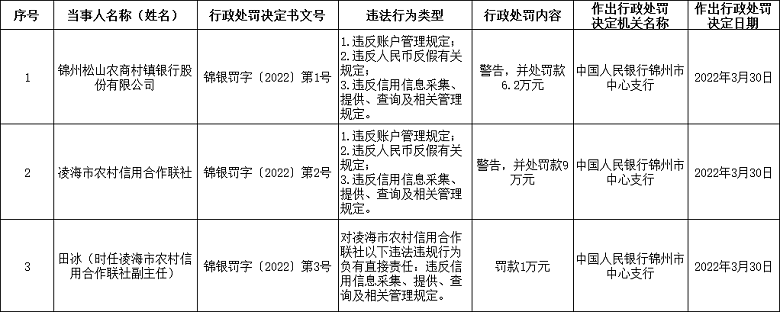 4月11日,中国人民银行沈阳分行行政处罚信息公示表显示,锦州松山农商村镇银行、凌海市农村信用合作联社均因违反账户管理规定、违反人民币反假有关规定、违反信用信息采集、提供、查询及相关管理规定,被中国人民银行锦州市中心支行警告,并分别被处罚款6.2万元、9万元。