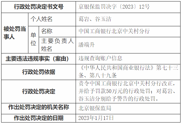 1月28日消息,银保监会行政处罚信息显示,中国工商银行北京中关村分行因存在“违规查询账户信息”这一违法违规行为,依据《中华人民共和国商业银行法》第七十三条、第八十九条,被北京银保监局处以罚款50万元,并责令其改正;对相关责任人葛岩、谷玉洁则分别给予警告。