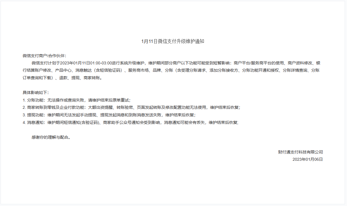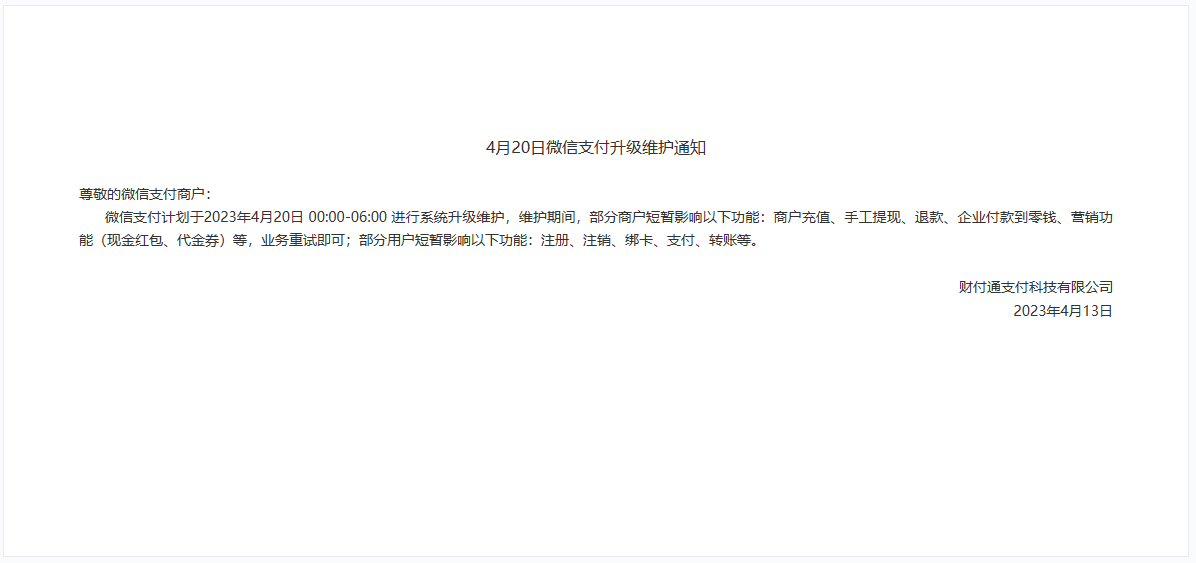 通知显示,在维护期间部分商户的充值、手工提现、退款、企业付款到零钱、营销功能(现金红包、代金券)等功能将受短暂影响。部分用户的注册、注销、绑卡、支付、转账等功能也可能受到影响。