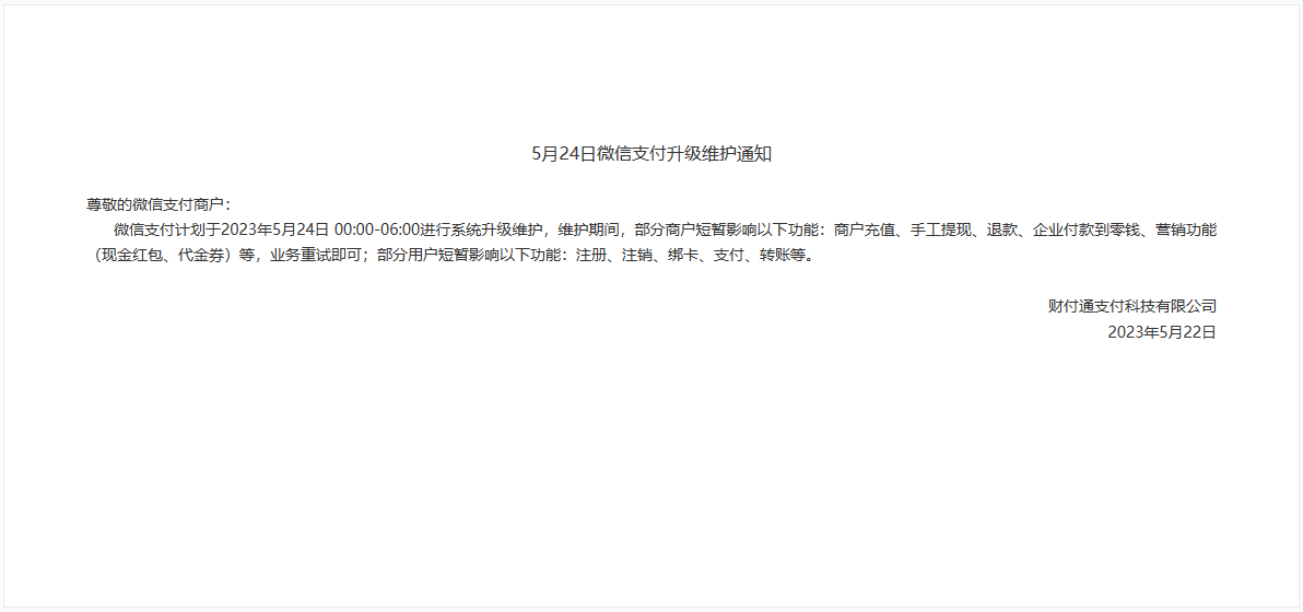 2023年5月22日,财付通发布《5月24日微信支付升级维护通知》,表示微信支付计划于2023年5月24日00:00-06:00进行系统升级维护。