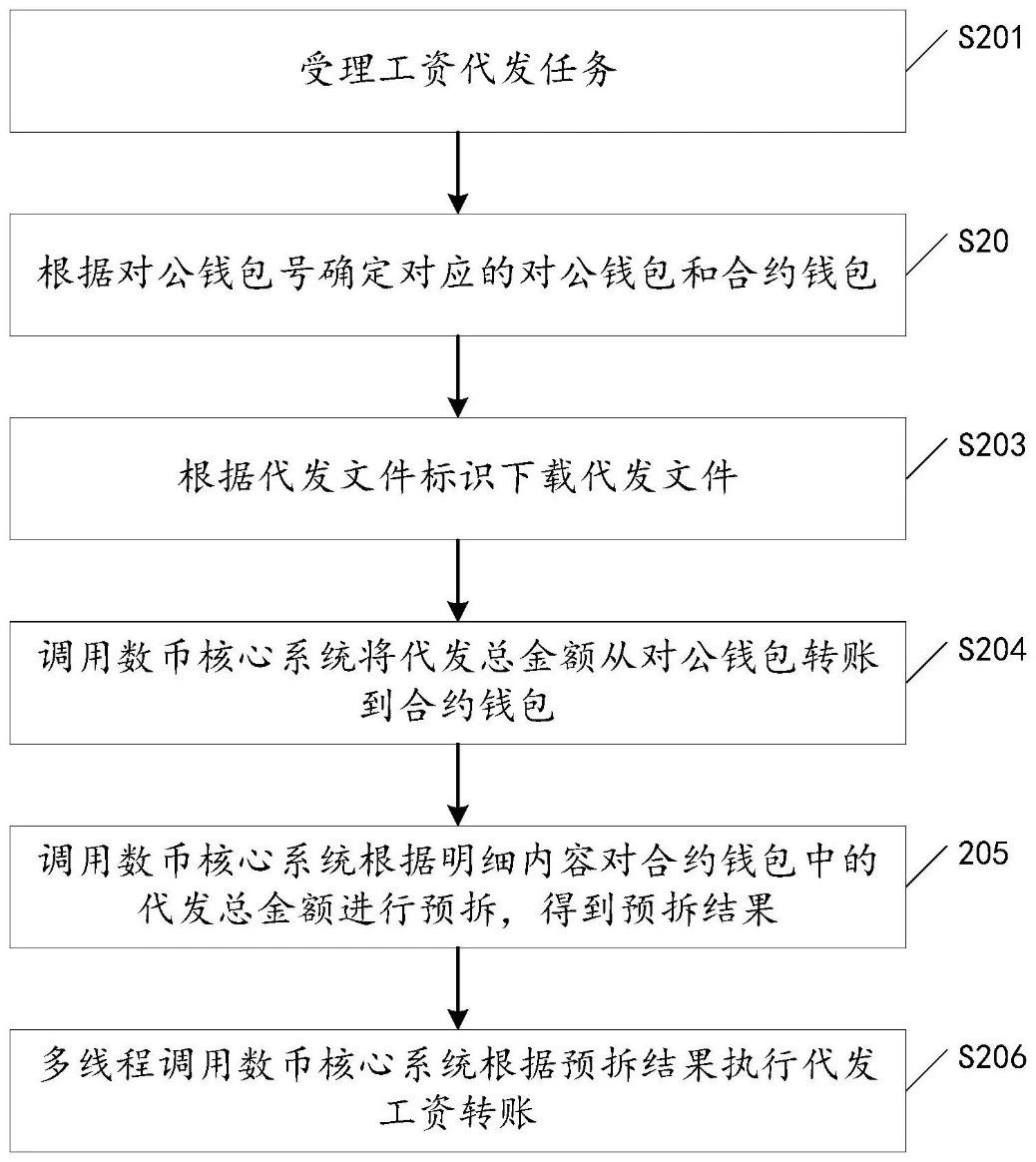 工资代发任务还包括代发文件加密值,代发总金额和代发总笔数。根据代发文件标识下载代发文件后,还需要:计算代发文件的当前加密值;若当前加密值与代发文件加密值一致,则对代发文件的文件内容进行解析,得到明细内容;根据明细内容计算当前代发总金额和当前代发总笔数;若当前代发总金额与代发总金额一致,且当前代发总笔数与代发总笔数一致,则执行步骤:调用数币核心系统将代发总金额从对公钱包转账到合约钱包。