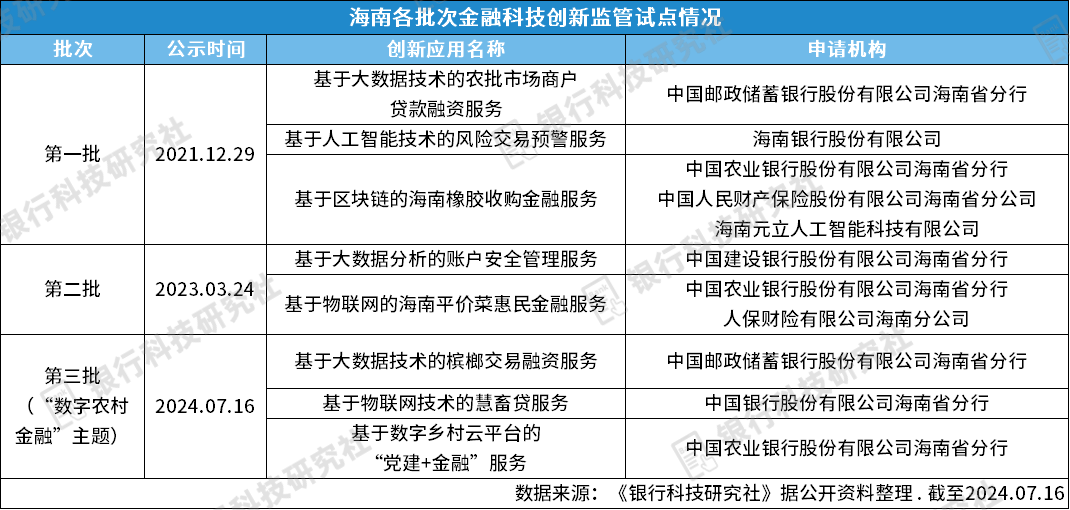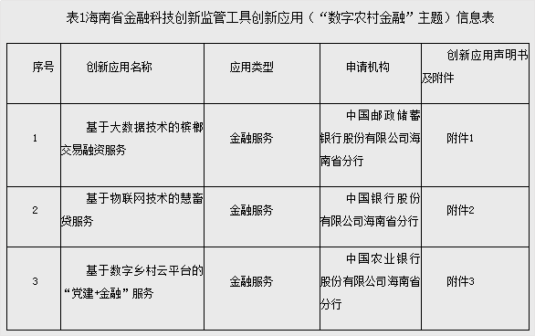 近日,海南省金融科技创新监管工具创新应用(“数字农村金融”主题)对外公示,这是该地区目前为止公示的第三批金融科技创新应用。