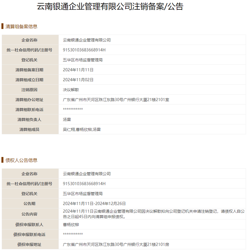 近日,又有一家“前”支付机构正在“决议解散”。根据国家企业信用信息,云南银通企业管理有限公司(简称“云南银通”)已发布注销备案/公告,已于2024年11月2日成立清算组。