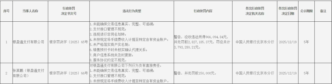 移动支付网12月26日消息,根据人民银行北京市分行最新公布的行政处罚决定信息公示表(银京罚决字【2025】65-66号),支付机构银盈通支付有限公司(简称“银盈通”)因八项违法行为被警告,没收违法所得约96.61万元,并处罚款282.72万元,罚没共计约379.33万元;相关责任人张某鹏被警告,并处罚款15万元。