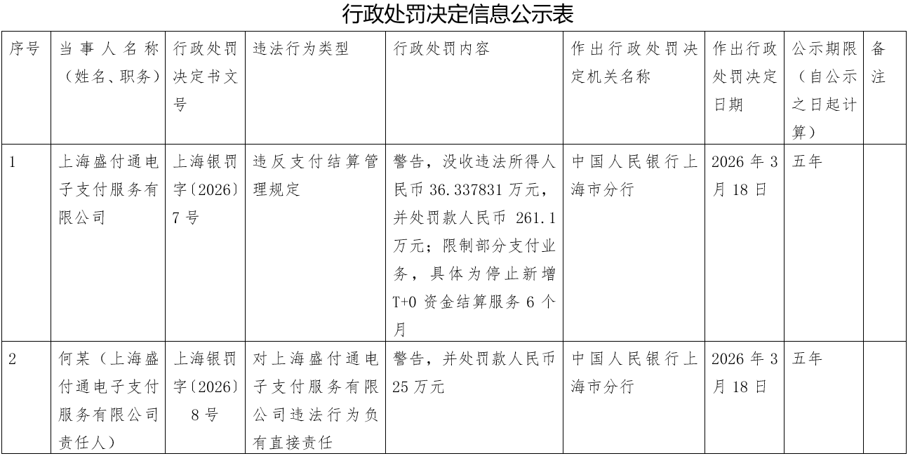 移动支付网3月26日消息,人民银行上海市分行最新公布的行政处罚信息公示表(上海银罚字〔2026〕7号、8号)显示,支付机构上海盛付通电子支付服务有限公司(下称“盛付通”)因违反支付结算管理规定,被警告,没收违法所得超36万元,并处罚款261.1万元。同时,盛付通相关责任人何某被警告并罚款25万元。