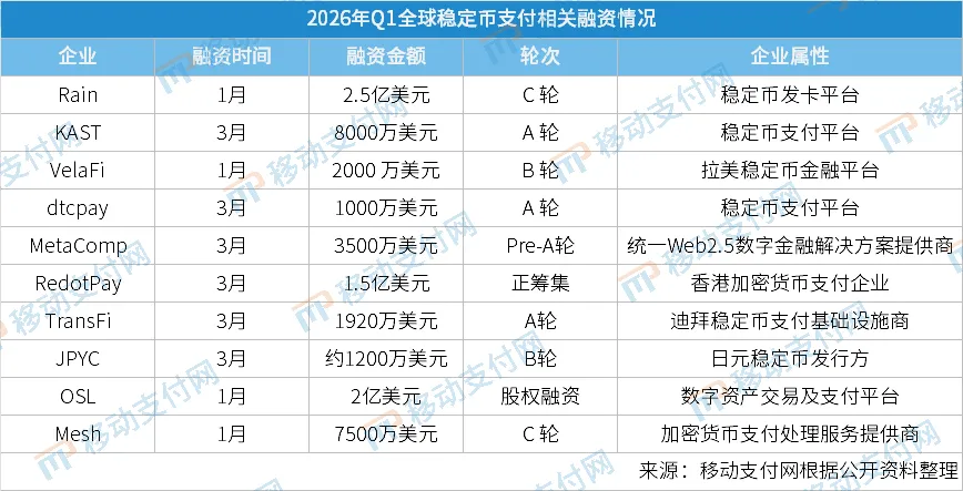 而在融资方面,2026年第一季度尚未结束,全球稳定币支付相关企业已完成多笔千万美元级以上融资。