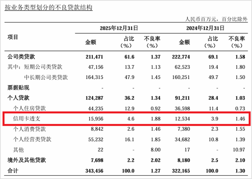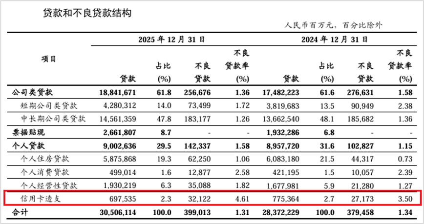 不良数据方面,2025年信用卡不良贷款238.6亿元,与2024年的236.8亿元基本持平;不良率2.36%,较2024年的2.22%小幅上升。